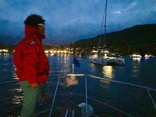 ![]() カタリーナ海峡を横断中の一枚 | ![]() 明朝の横断を前に静寂なサンタ・カタリナ島 |