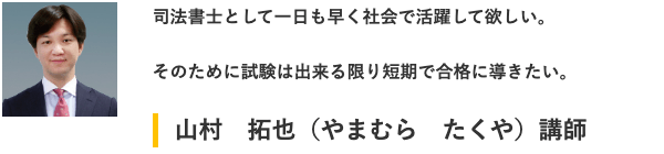 山田講師は明治大学法学部を卒業し、司法書士試験合格後には大手資格学校で司法書士試験の受験指導を行ったのち、大手通信教育会社や大手法律事務所での勤務経験を経て、司法書士事務所を独立開業した人です。